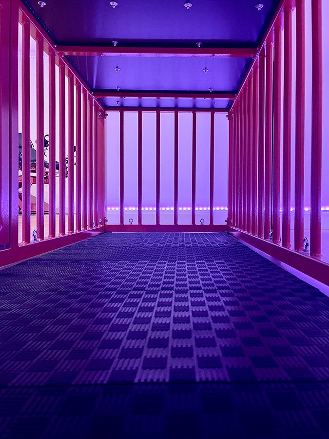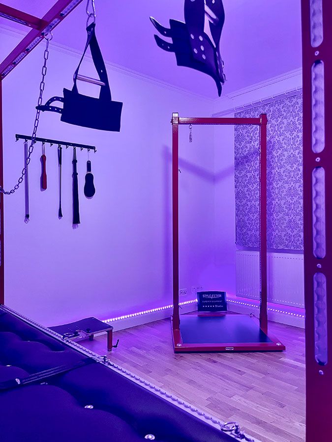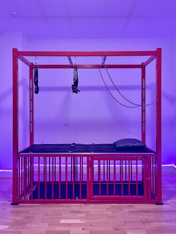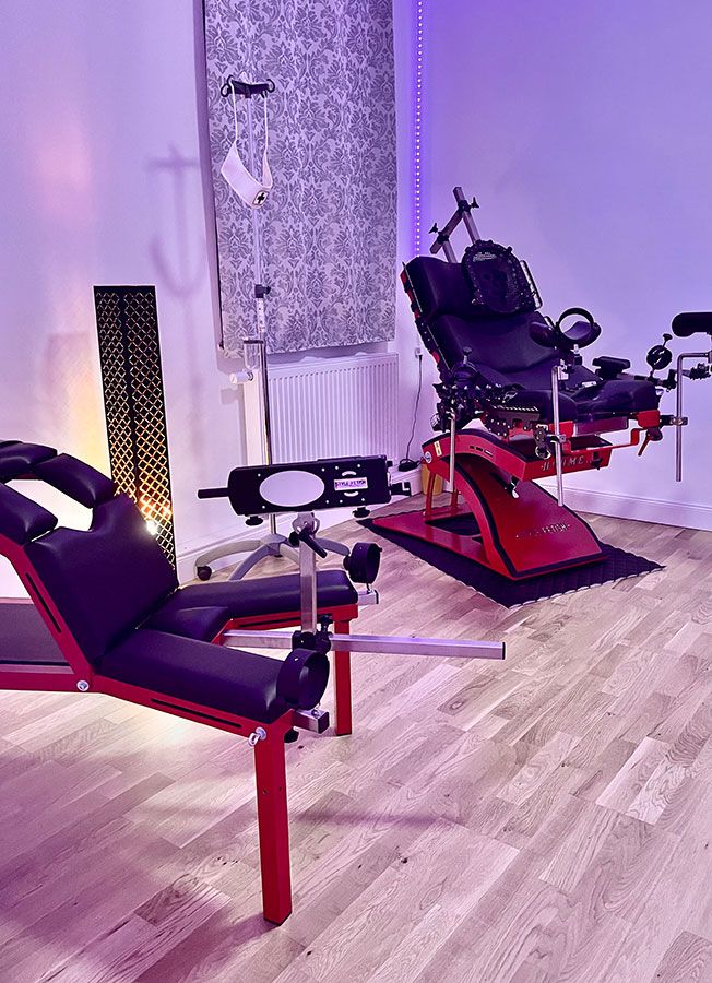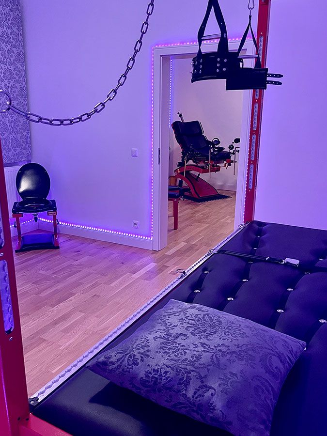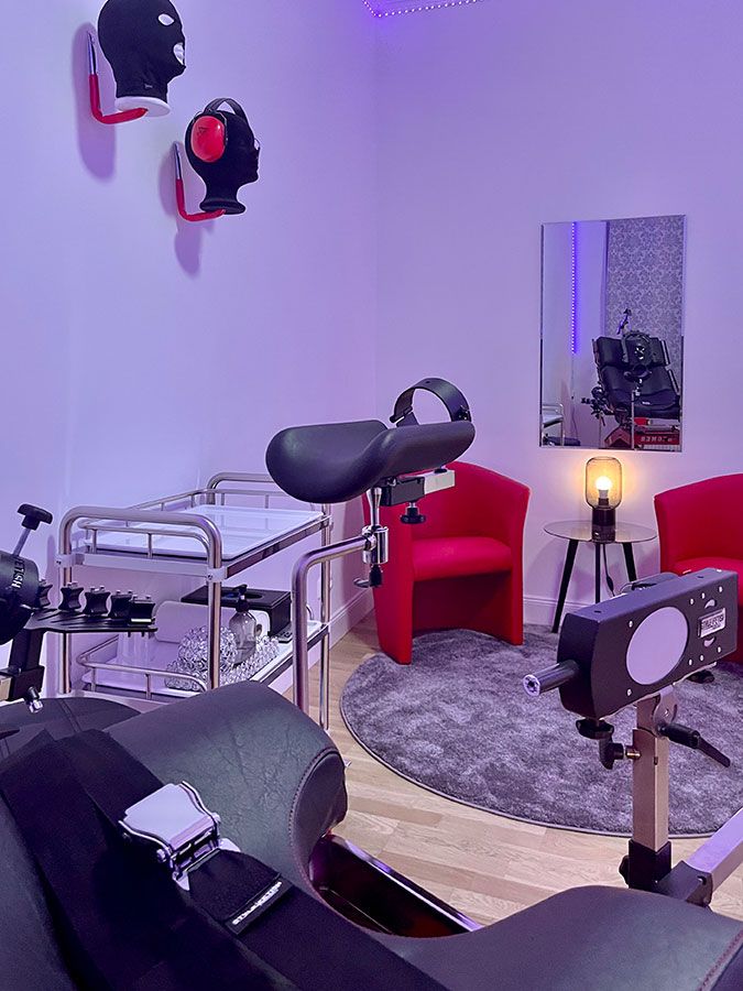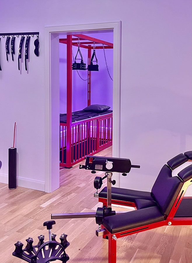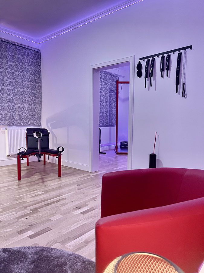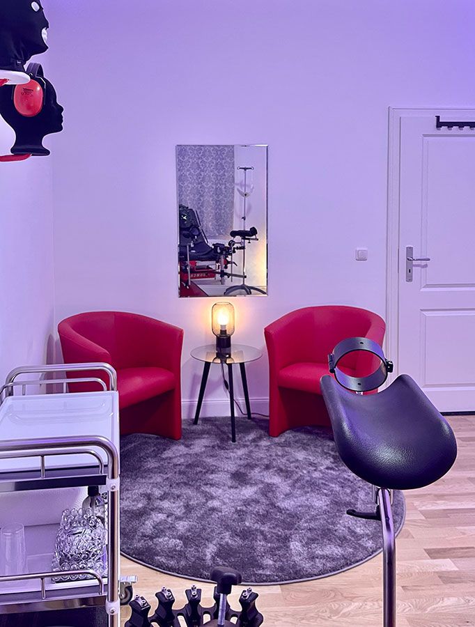 Ein Einblick in das 33 qm große rote Themenzimmer mit drei Meter hohen Decken, zwei Loungesesseln und komplett ausgestattet mit professionellem BDSM-Mobiliar aus dem Hause Style Fetish Industries: