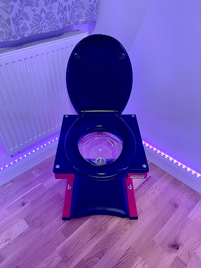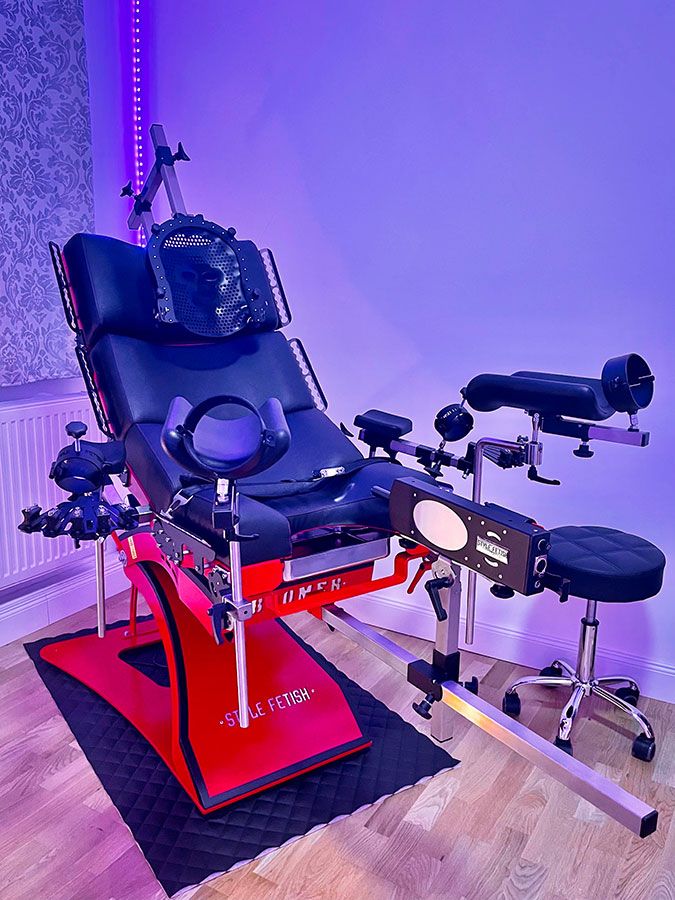 Gynstuhl *Super Boomer*, Strafbock Syndicate 2.0, Freistehendes Fesselgestell, Behandlungsliege mit Stahlhimmel und integriertem Käfig, Domina Toilette *Dirty Dreams* mit Plexiglasschüssel und Genital-Trample-Tisch.